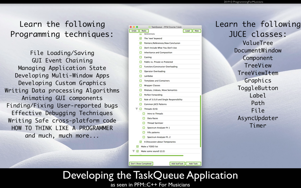 Developing TaskQueue is the perfect followup project after completing PFM::Language Fundamentals. You will learn to navigate the JUCE framework, as well as apply all of the C++ skills you learned in PFM::C++.